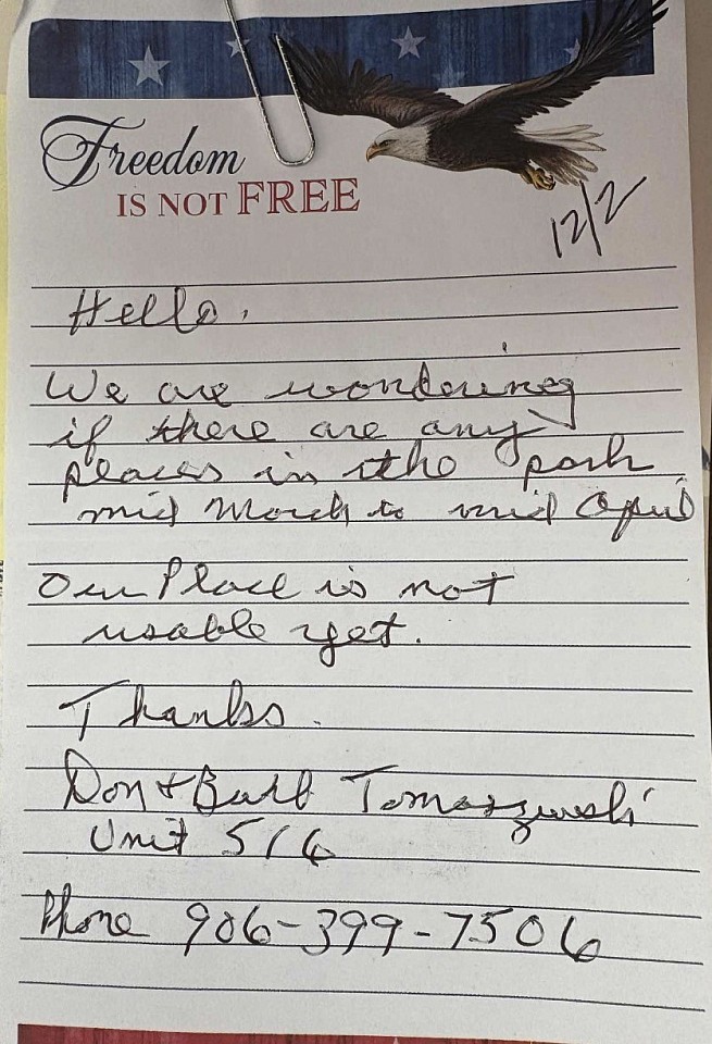Subject Looking to Rent Dec 29th 2025 thru Feb 2026 Message My wife Cindy and I are looking to rent a unit in Lakeshore Park. We are interested in joining the community, and would like to try before we buy. Please email, text or call if you have, or know of a unit to rent during this period. Thanks Ken 901/605-0733 [email protected]