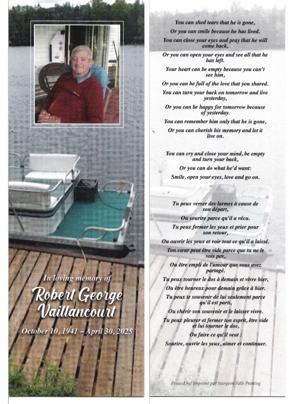 As his wishes, no celebration will be held. Funeral arrangements in care of the Theoret-Bourgeois Funeral Home, Sturgeon Falls. In lieu of flowers, donation to the Cancer Society would be appreciated.