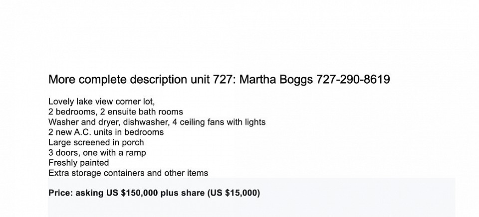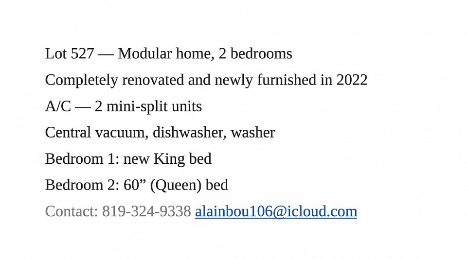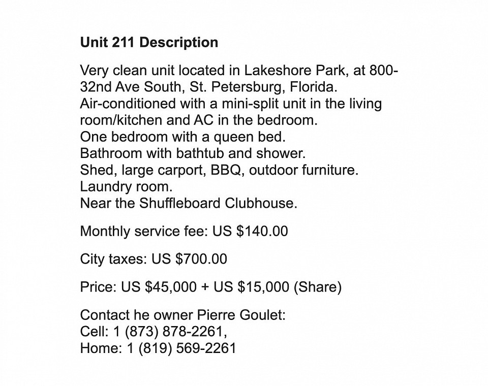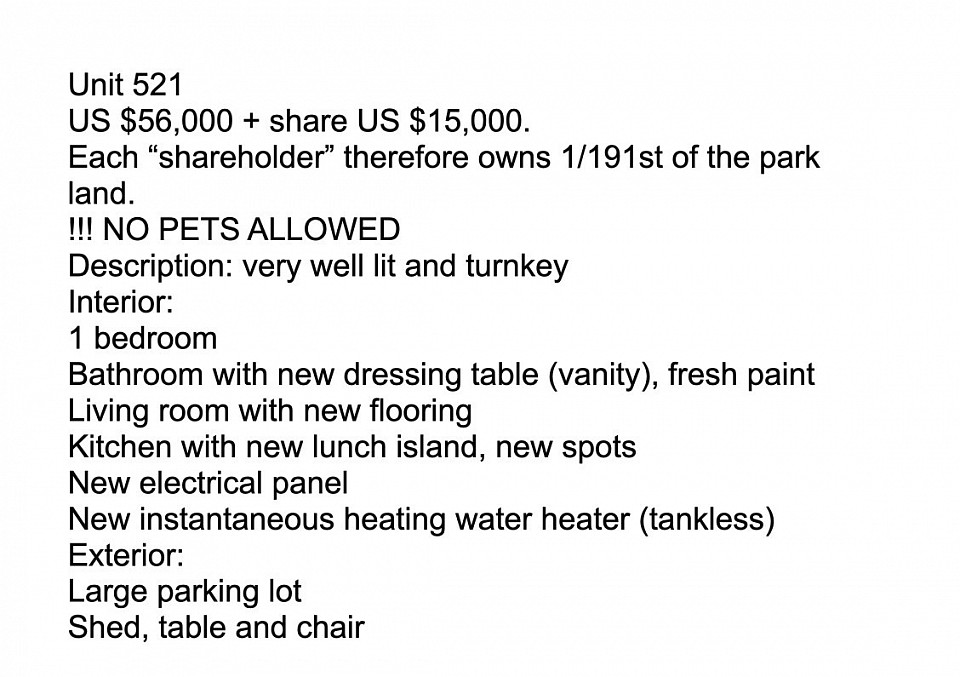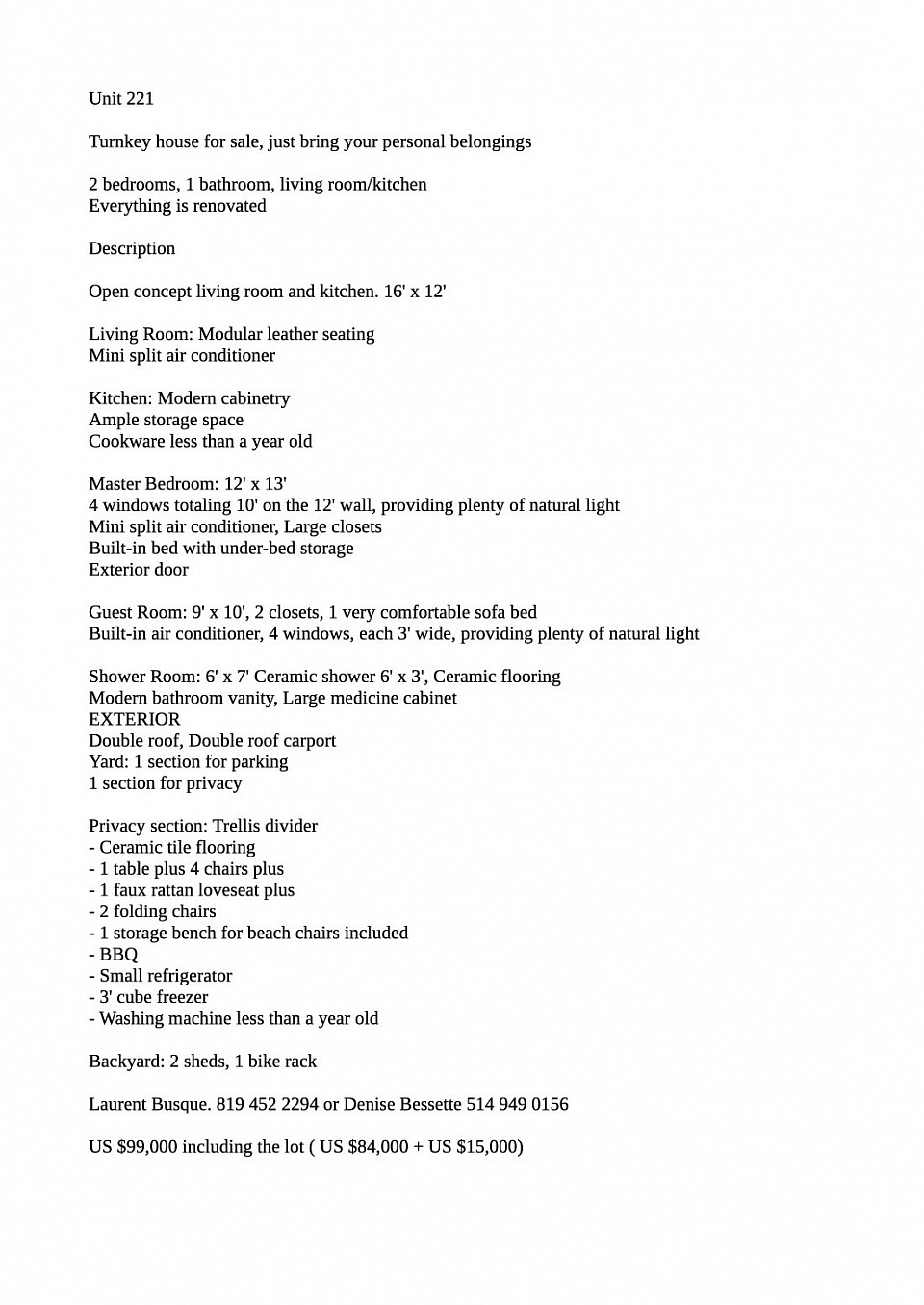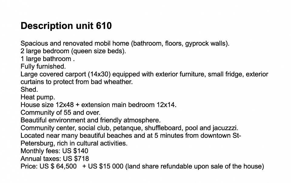 This beautiful double factory house is located in a cooperative mobile home park, so you own a share of US $15,000 which will be refunded when you sell. This is a 55+ community and pets are not allowed. There is an electric fence surrounding the park, an heated pool, a spa, shuffle board, petanque and a club house where a lot of activities are happening. There is also a large parking area for boats, trailers and RV.
